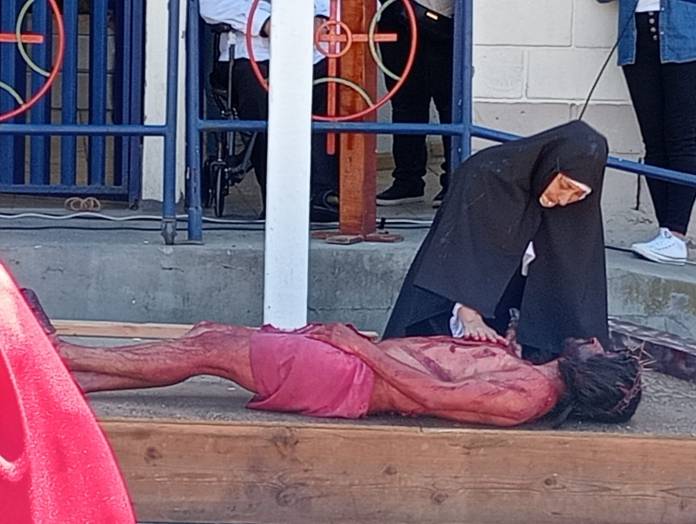 Durante tres horas más de un centenar de personas presenció cada movimiento en torno a esta esperada obra basada en los Evangelios, no solo frente al recinto católico, sino que acompañaron al portador de la cruz que por varias cuadras la llevó a cuestas, entre gritos y silencios esperados.